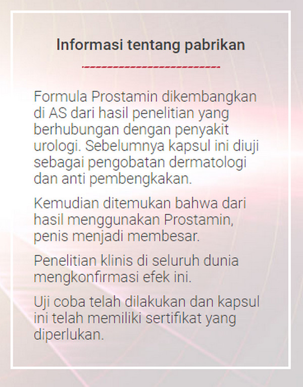 Prostamin pembesar penis memungkinkan hanya untuk satu bulan penggunaan rutin sesuai dengan instruksi untuk meningkatkan ukuran panjang penis hingga 5-7 cm dan dalam ketebalan hingga 30%. Sebelum penampilan Prostamin, hanya mungkin untuk mengandalkan hasil yang sama menggunakan layanan ahli bedah, karena metode praktis – ekstender dan pompa – sama sekali hanya memberikan efek jangka pendek dan ditandai dengan penggunaan yang menyakitkan. Dengan Prostamin pembesar penis anda dapat meningkatkan anggota secara alami! Selain itu, efek menguntungkan kapsul pada potensi dan ereksi, kemampuannya untuk memperpanjang hubungan seksual akan memungkinkan semua pria menjadi raksasa seks nyata.